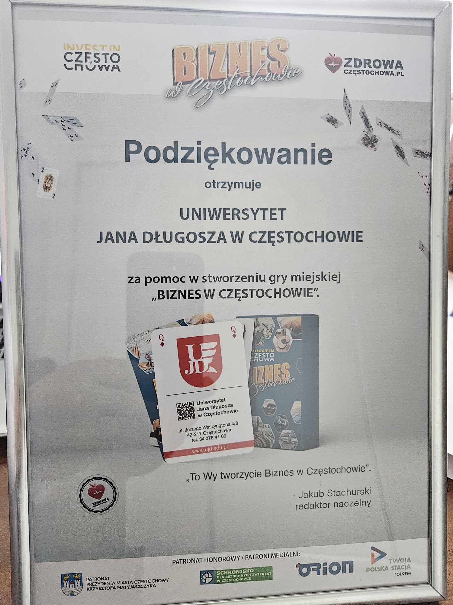 "Business in Częstochowa" was the slogan under which a full deck of playing cards was published. Among them there are two cards: the Queen of Hearts and the Queen of Diamonds. The logo of Jan Dlugosz University in Czestochowa was placed on them, along with the logo and contact details.