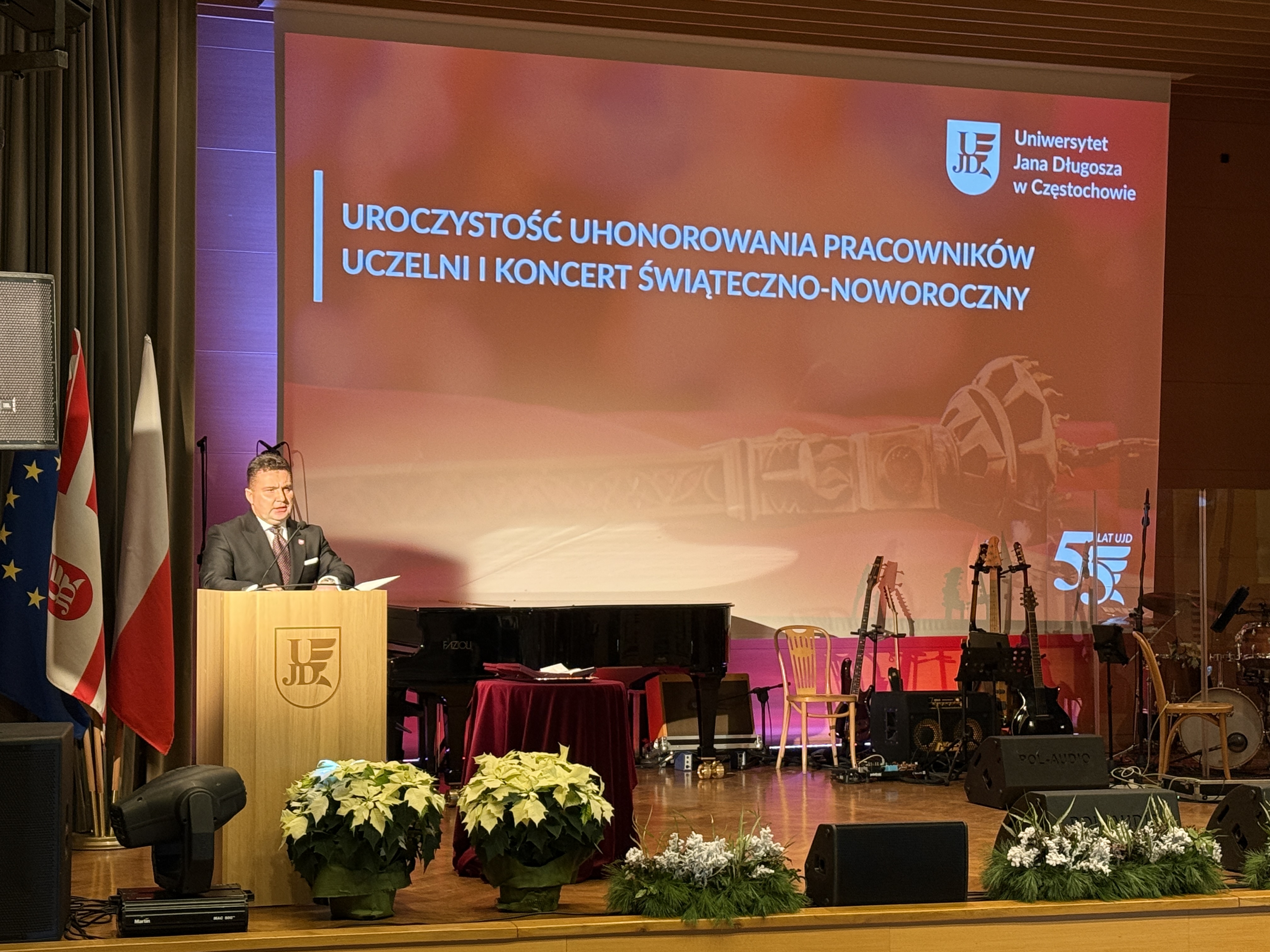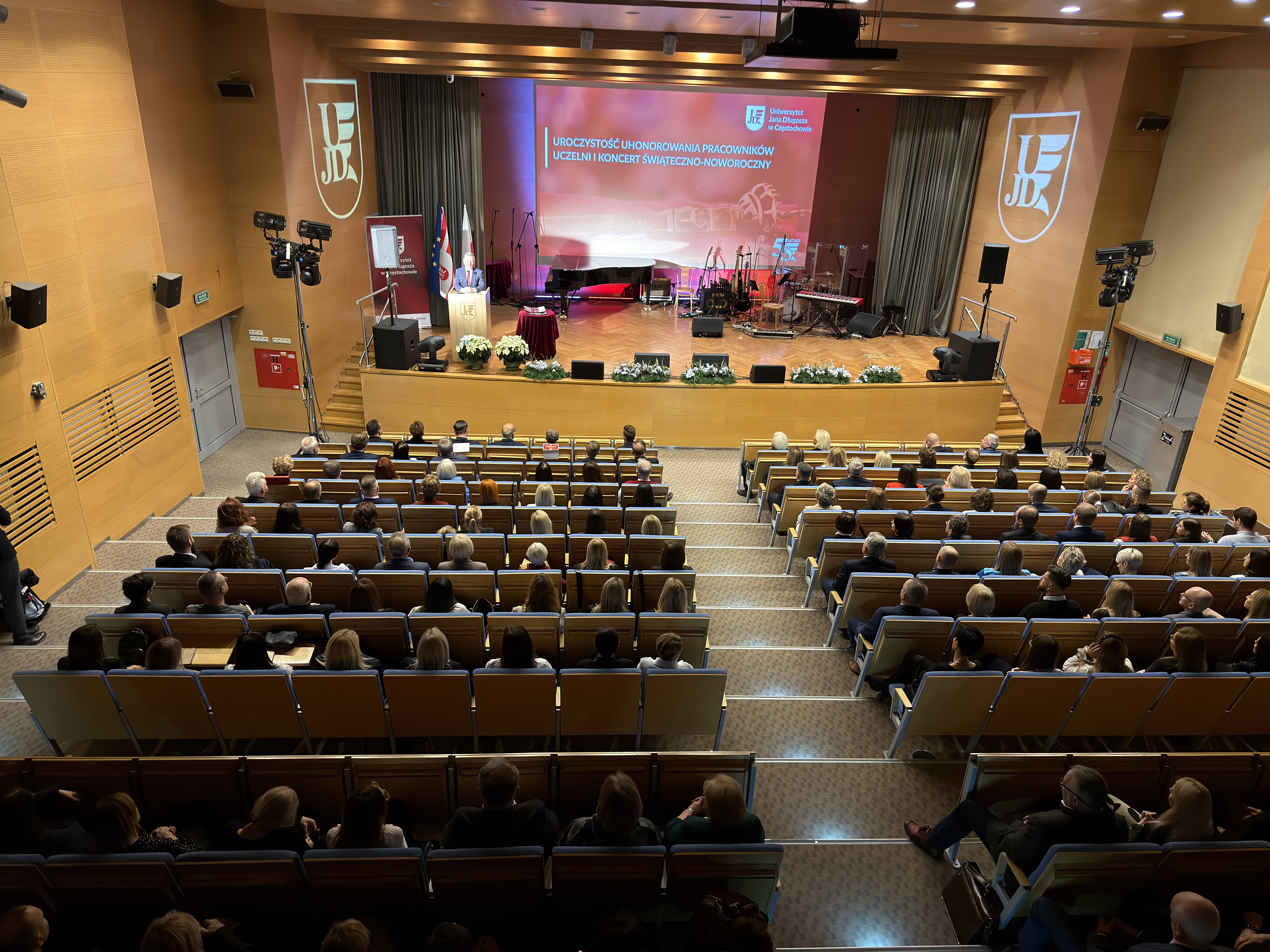 The Christmas and New Year’s concert combined with the ceremony of awarding medals, distinctions, and certificates of recognition took place today (12 December 2025) in the Aula Magna of Jan Dlugosz University in Czestochowa (13/15 AK). At the opening, the Acting Rector, prof. Bogusław Przywora, addressed the University staff gathered in the hall: