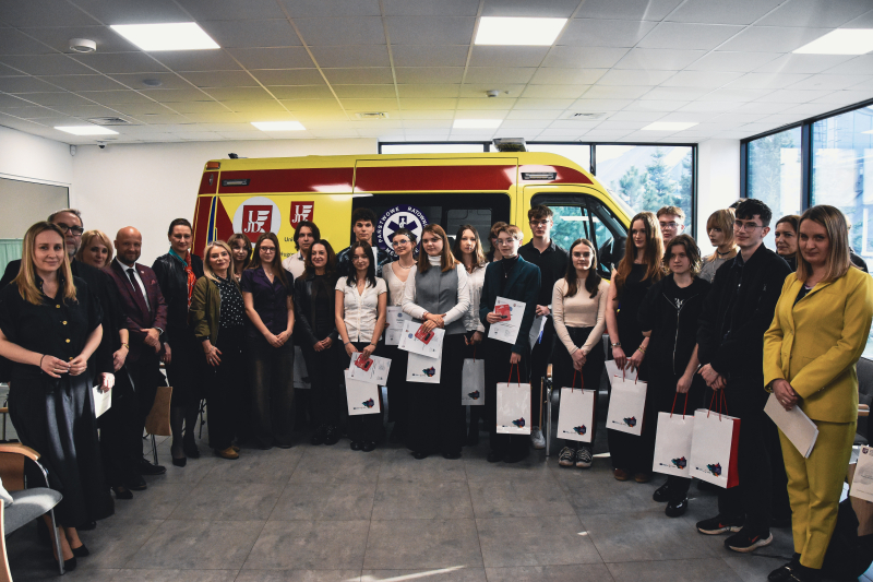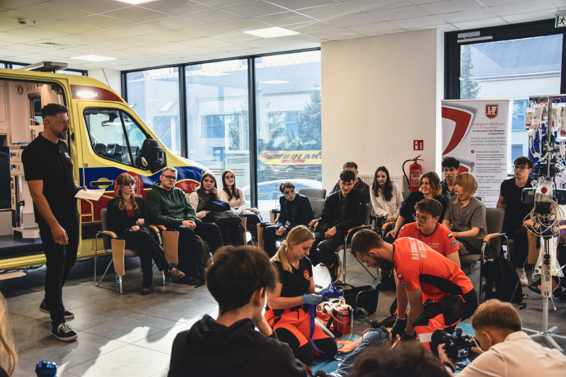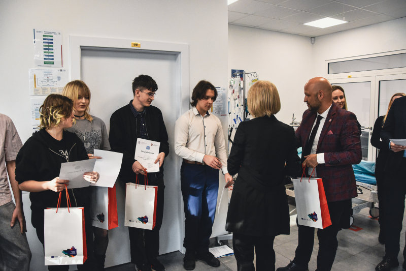 After completing the language challenges of the third stage, participants and their teachers attended a lecture delivered by dr Kacper Packi entitled: “Steak allergy. A mysterious disease from the USA that has reached Europe.” Afterwards, the students of the Emergency Medical Services programme, under the supervision of Mmgr Wojciech Szczurak, conducted a professional first aid demonstration.