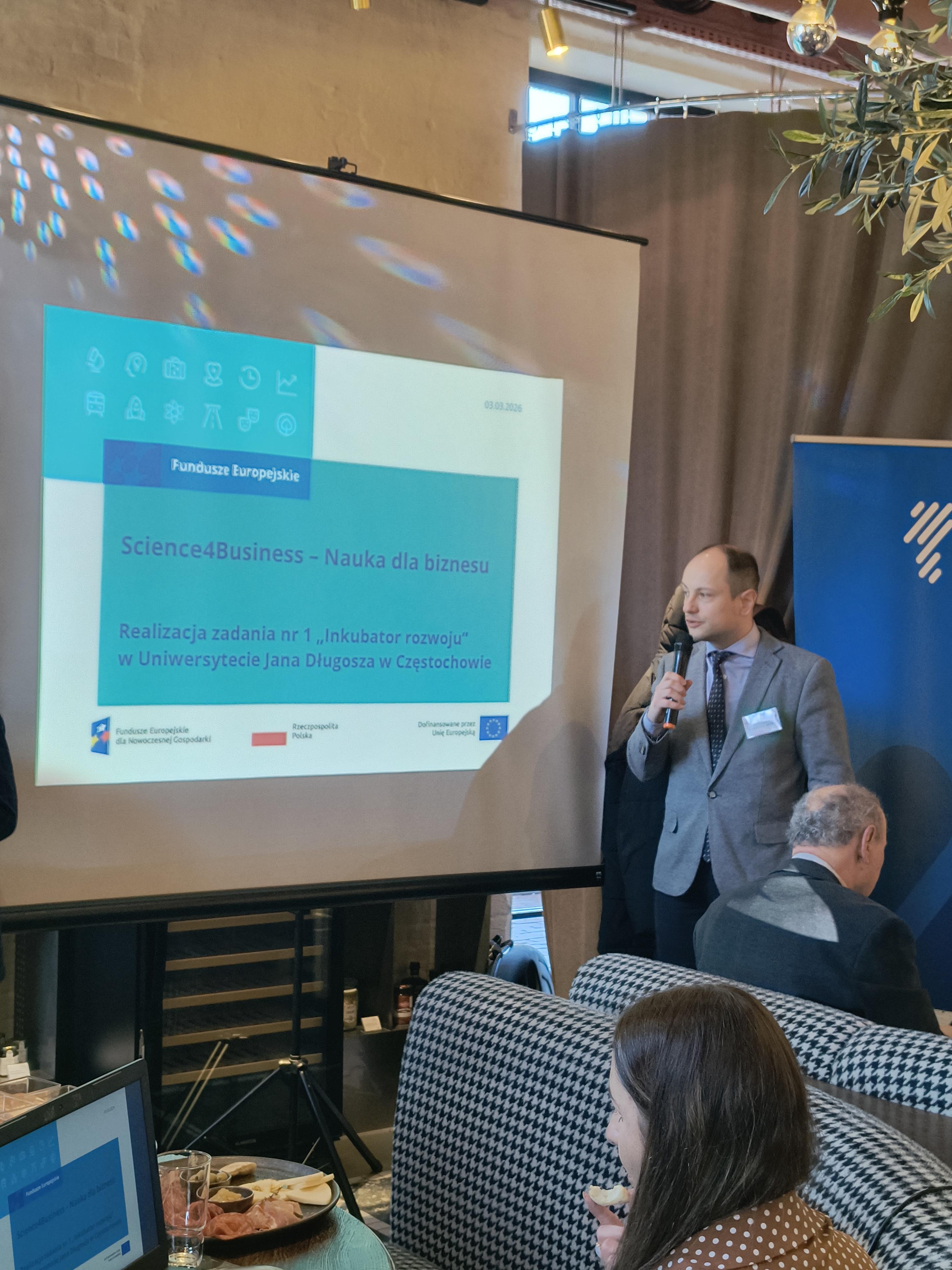 Rozmowy biznesowe poprzedziły wystąpienia partnerów, w czasie których dr Kordian Chamerski, specjalista ds. transferu technologii z Centrum Transferu Wiedzy i Innowacji w Obszarze Nauki i Sztuki UJD zapoznał przedsiębiorców z założeniami realizowanego w UJD Projektu „Science4Business – Nauka dla biznesu” oraz przedstawił działania realizowane w Projekcie w Zadaniu nr 1 "Inkubator Rozwoju" nakierowane na współpracę z podmiotami otoczenia społeczno-gospodarczego.