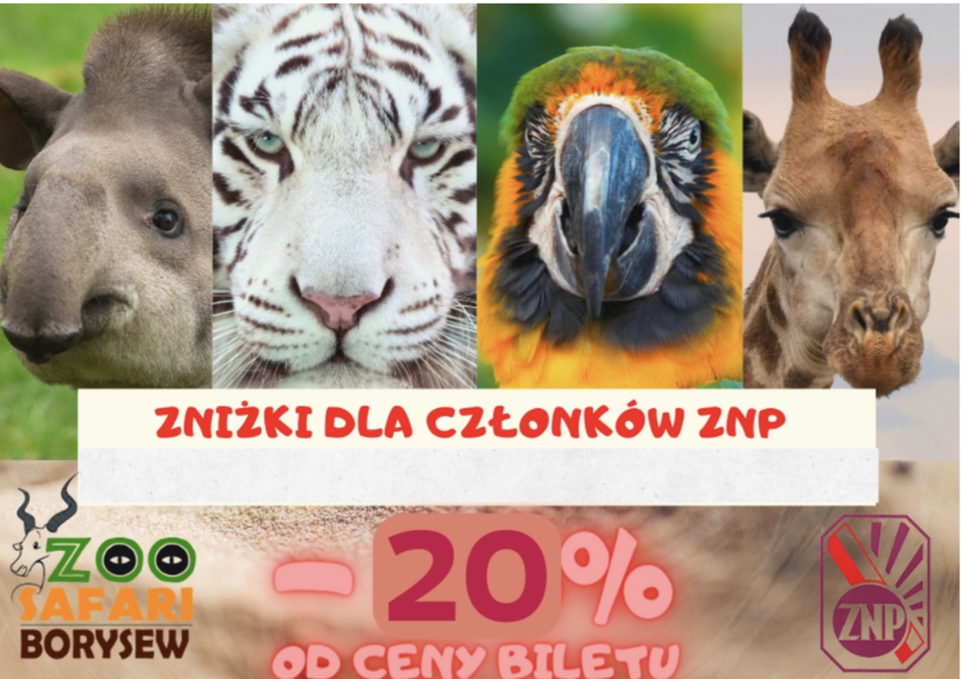 ZOO Safari w Borysewie oferuje dla członków ZNP zniżki 20% od ceny biletu. Dla członków ZNP przygotowana została specjalna zniżka w wysokości 20% od regularnej ceny biletu w kasie ZOO. Aktualny cennik biletów dostępny jest na stronie https://zoosafari.com.pl/cennik/ |