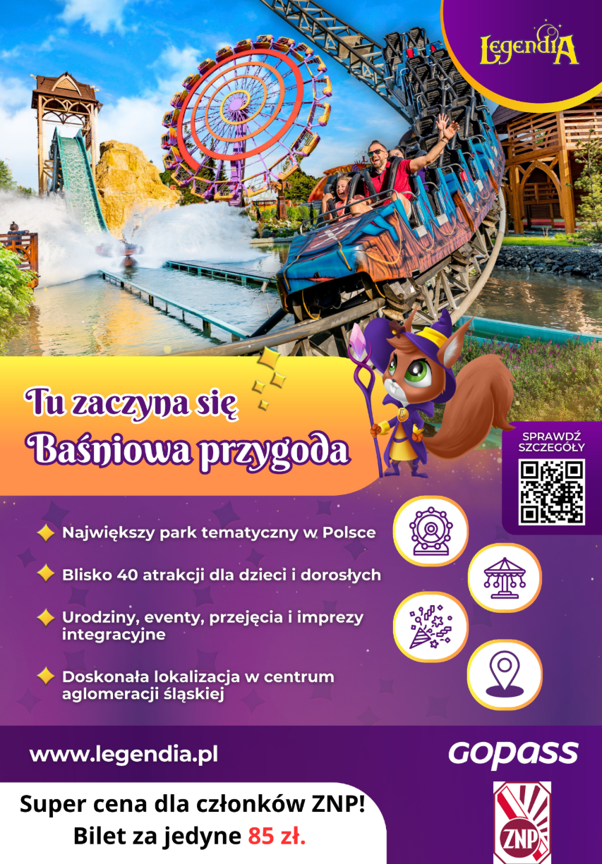 Zniżki do "Legendii" - Śląskiego Wesołego Miasteczka (www.legendia.pl) dla członków ZNP. Cena biletu dla członków ZNP 85 zł jest bardzo korzystna, ponieważ zwykła cena biletu - nawet zakupionego przez internet jest znacznie wyższa. Do zakupu biletów do Legendii nie jest konieczne okazywanie legitymacji związkowej, wystarczy posiadanie kodu GoPass. Osoby zainteresowane uzyskaniem kodu Go Pass proszone są o kontakt mailowy (e.sokolowska@ujd.edu.pl). Kody Go Pass zakupione na sezon 2025 są ważne do dnia 23 października 2025 r. | ![]() |