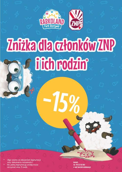 Zatorland oferuje 20 % zniżki dla członków ZNP i ich rodzin. Członek ZNP może kupić bilet z taką zniżką dla siebie oraz dla rodziny (małżonka/małżonki i dzieci). Wystarczy okazać nową legitymację ZNP (plastikowa bez zdjęcia) i dowód tożsamości ze zdjęciem w kasie biletowej! https://zatorland.pl/ |