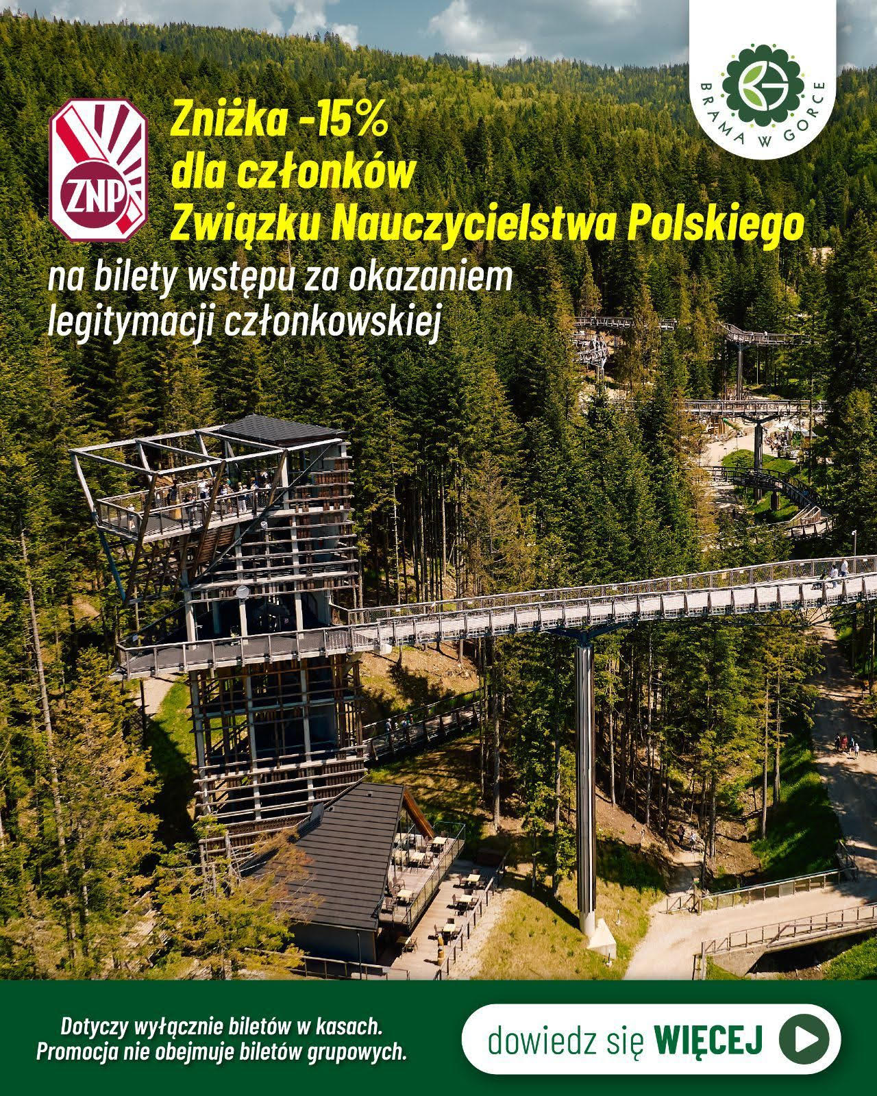 Centrum Przyrodniczo-Edukacyjne Brama w Gorce. Członkom ZNP przysługuje zniżka -15% na bilety wstępu za okazaniem legitymacji (jeden bilet na osobę). Zniżka dotyczy wyłącznie biletów zakupionych w kasie. https://bramawgorce.com/ |