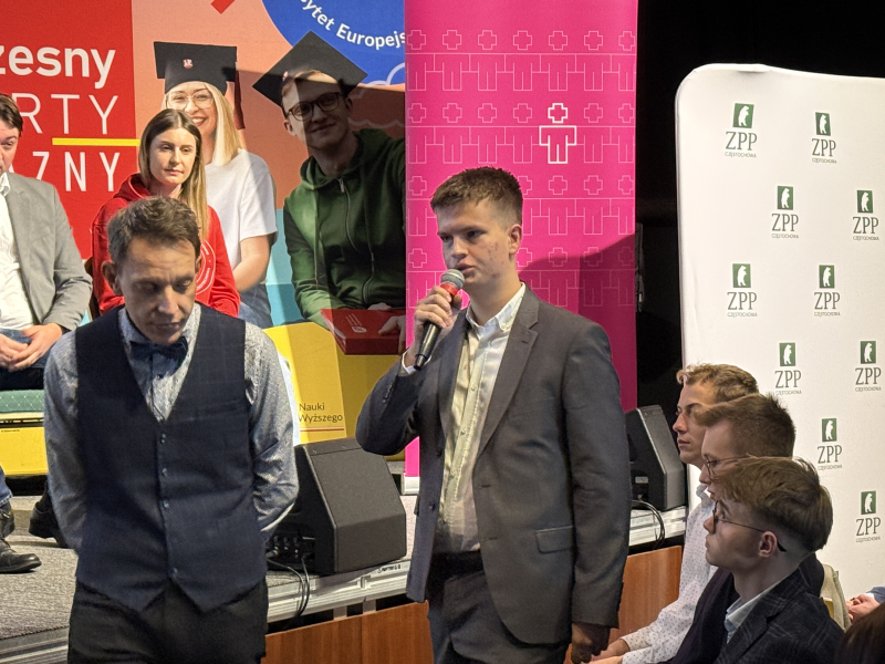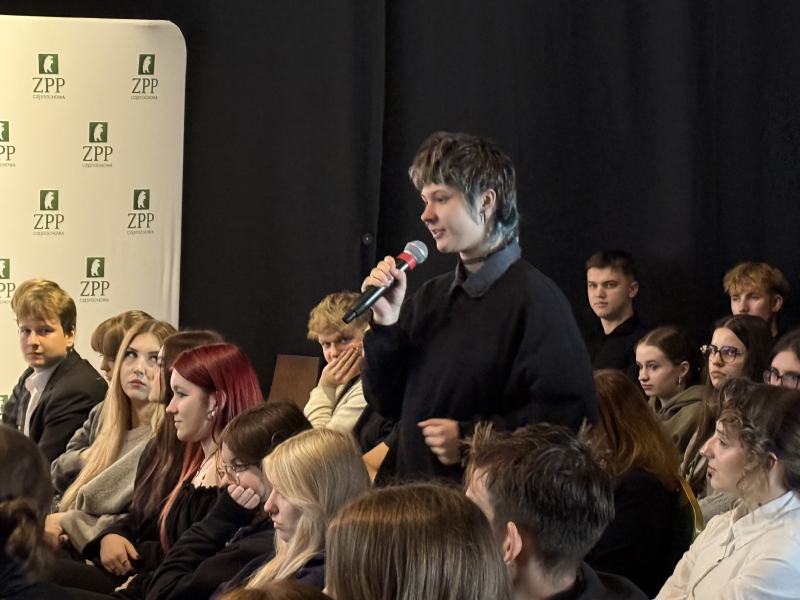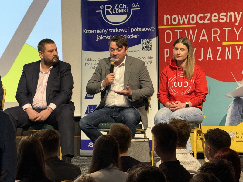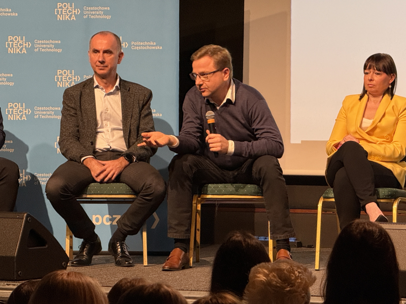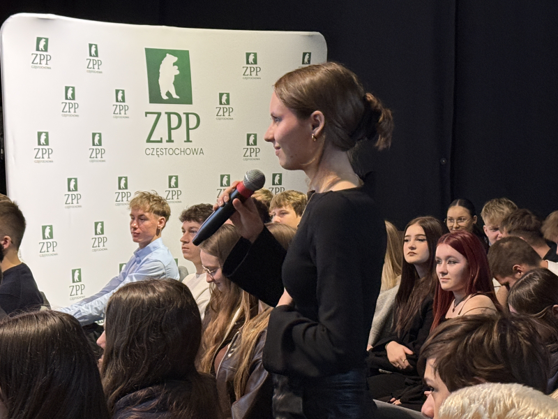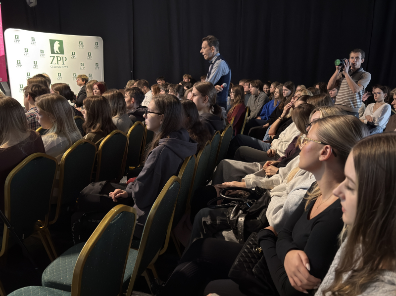 Młodzież aktywnie uczestniczyła w dyskusji, zadając pytania dotyczące m.in. wyboru ścieżki zawodowej, oferty edukacyjnej uczelni, sztucznej inteligencji oraz perspektyw zatrudnienia w Częstochowie.