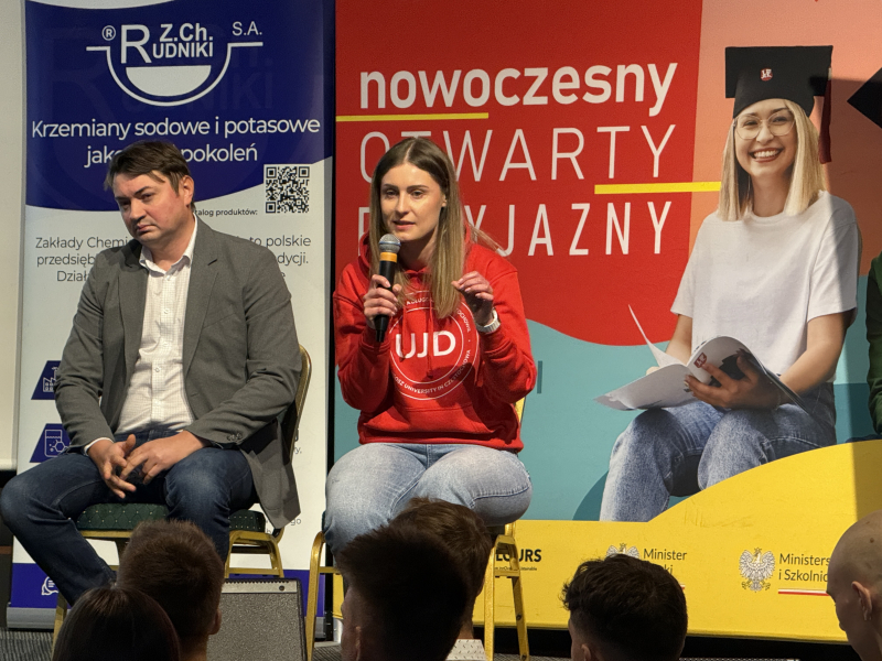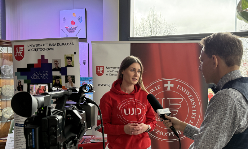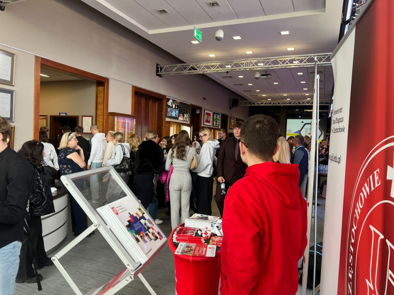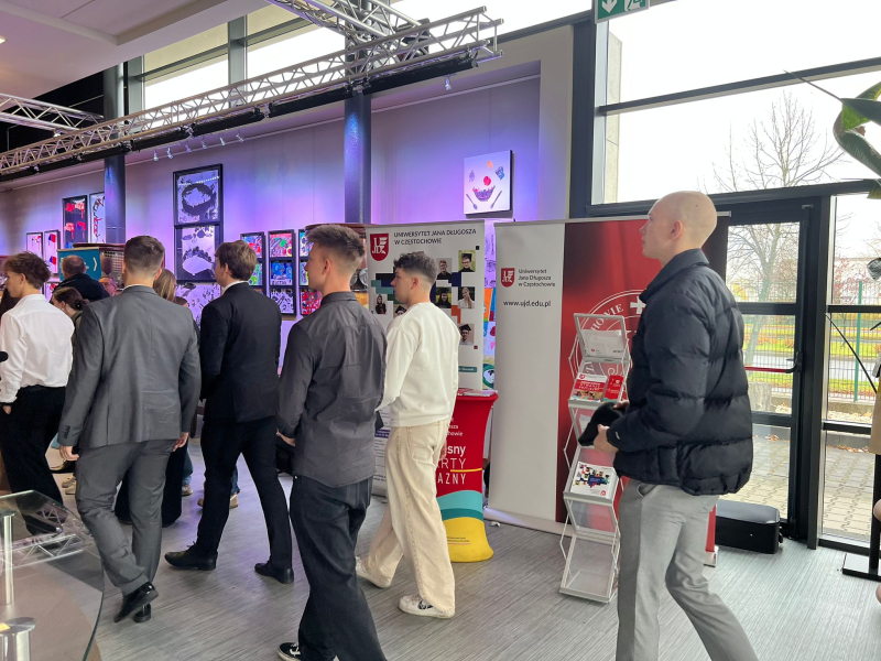 Młodzież mogła również odwiedzić stoisko promocyjne, zasięgnąć informacji o rekrutacji oraz otrzymać materiały promocyjne UJD. Stoiskiem opiekowali się lic. Julia Blukacz i mgr Konrad Balas, pracownicy Działu Komunikacji i Marketingu.