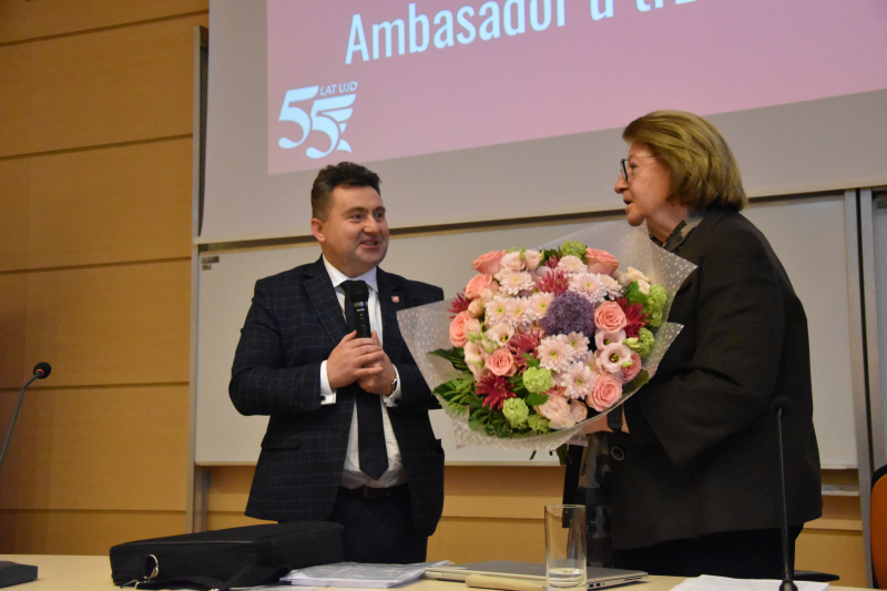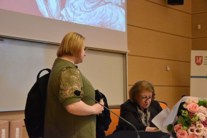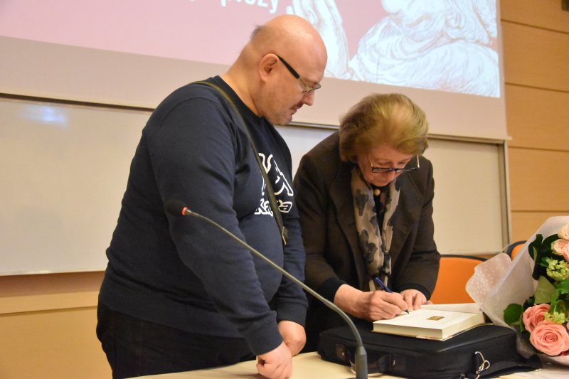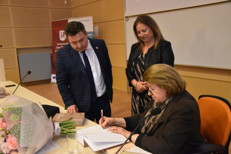 Na koniec spotkania rozległy się brawa dla prelegentki, a p.o. Rektora UJD prof. Bogusław Przywora podziękował jej wręczając kwiaty od społeczności akademickiej. Dodajmy, że ukoronowaniem pobytu pani profesor w naszym Uniwersytecie stał się zadedykowany jej koncert, który odbył się w Filharmonii Częstochowskiej.