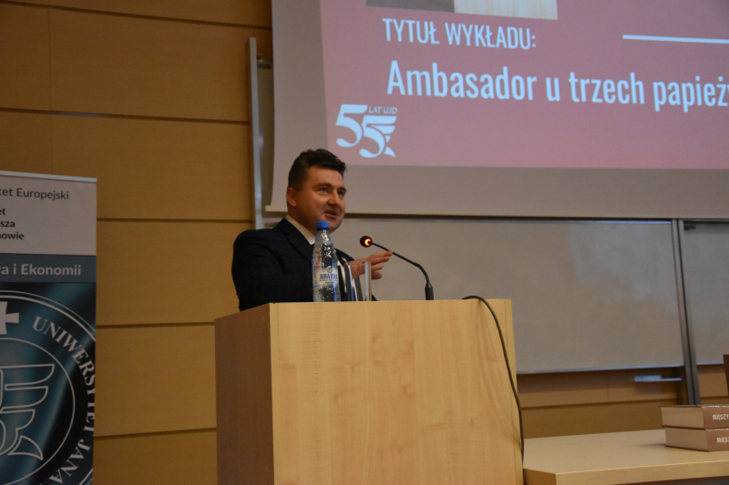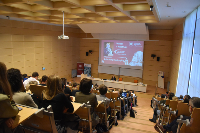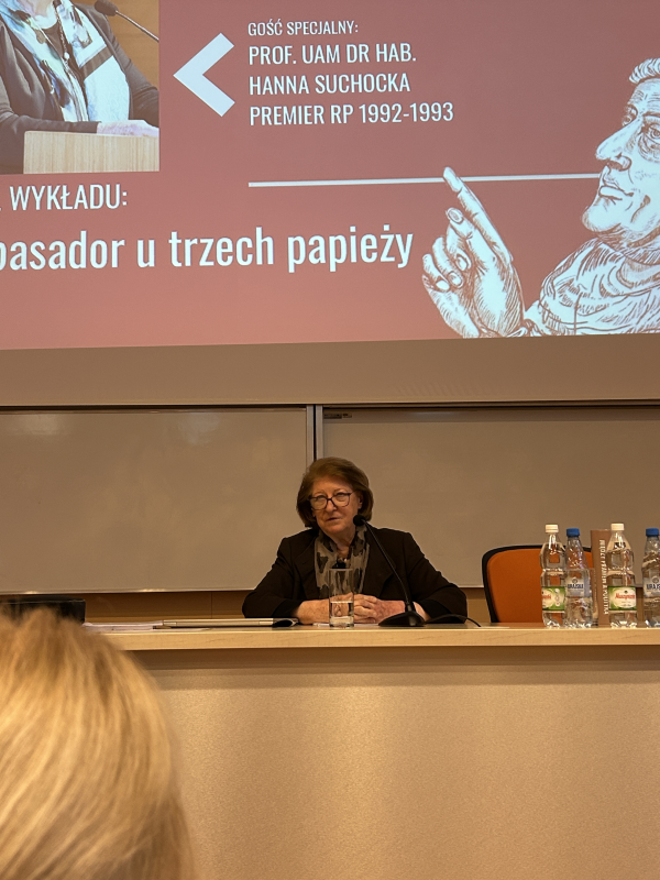 Spotkanie z dr hab. Hanną Suchocką, prof. UAM odbyło się w ramach realizowanego przez pracowników Uniwersytetu Jana Długosza w Częstochowie cyklu „Wykłady u Długosza” (22 kwietnia 2026 roku). Tym razem z uwagi na ogromny dorobek prelegentki oraz możliwość poruszenia wielu kwestii zdecydowano, że spotkanie zostanie zatytułowane „Ambasador u trzech papieży” – tak by bardziej skoncentrować się na służbie dyplomatycznej, którą pani profesor pełniła w Stolicy Apostolskiej w latach 2001-2013.